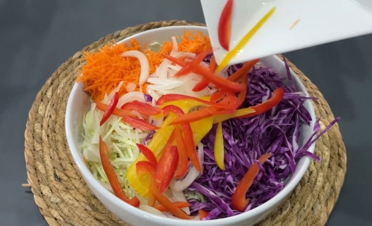 - Cut 1/4 of a red bell pepper and yellow bell pepper into thin strips. I make sure they’re about the same size as the cabbage shreds for a uniform texture. Add them to the large bowl.
