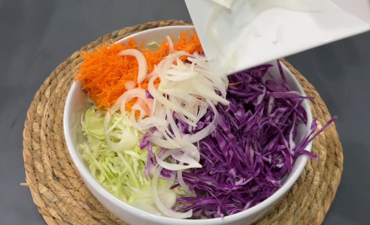 Take 1/4 of a white onion and slice it as thinly as you can. Thin slices blend better and won’t overpower the dish. Add them to the bowl with the veggies.